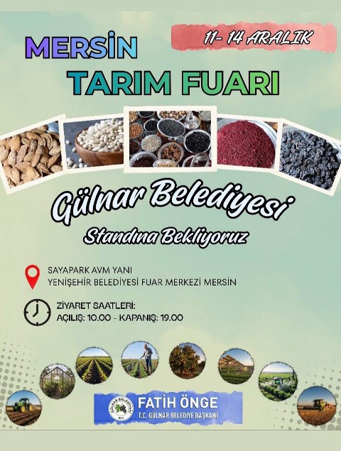 "Gülnar İlçemizde 0 rakımdan 1600 rakımda yetişen organik ürünlerimizi 11-14 Aralık Tarım Fuarı’nda yerimizi aldık. Bu geniş rakım farklılığı, ilçemizin tarımsal çeşitliliğini ortaya koyuyor. Badem ,Elma, zeytin,zeytin yağı,sumak vb ürünleri doğanın kalbinden gelen bu eşsiz lezzetleri tüm fuar ziyaretçilerimize sunuyoruz."