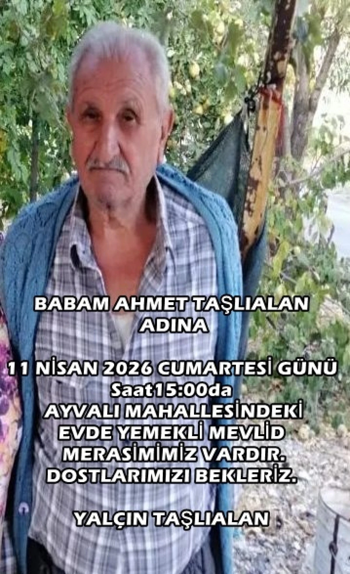 11 Nisan 2026 cumartesi günü saat 15:00'dan sonra Ayvalı Mahallesi Büyükalan Caddesindeki evimizde Rahmetli Babam Ahmet Taşlıalan adına yemekli mevlid merasimimiz vardır.müsait olan dostlarımızı bekleriz
